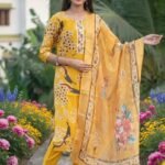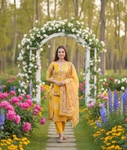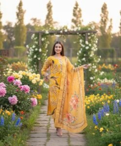 Step into timeless elegance with this stunning 3-piece kurti set, designed to blend comfort with graceful style. The rich Yellow kurti features a delicate floral print with tasteful detailing around the neckline, creating a refined and feminine look. Paired with matching straight-fit pants and a lightweight printed dupatta with an elegant border, this set offers a complete and effortlessly chic outfit.